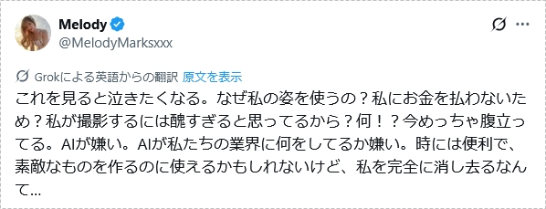 ここ最近AVでも使われるようになってきたAI作品(主に顔だけAIで変更して体はそのまま)。これについて、日本AVで大ブレイクした「メロディー・雛・マークス」さんが、自身がAI作品で使われていることに苦言を呈していました。